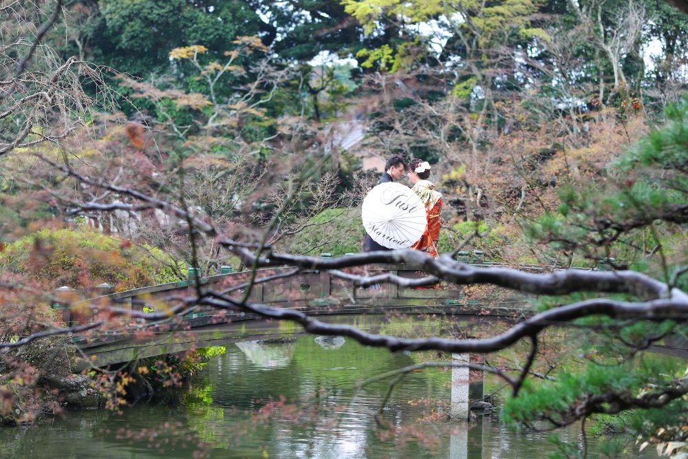 結婚式の前撮り・後撮りとしても人気が高く、季節限定の「紅葉フォト」も好評です。